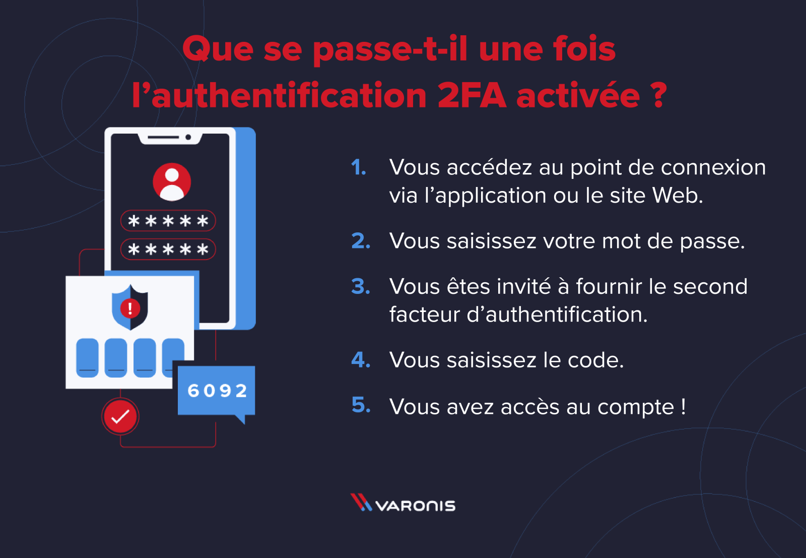 Au moins trois conditions doivent être validées pour mettre en place l'authentification forte 2FA : un identifiant (login), un code d'accès (mot de passe), un appareil que je possède (smartphone, ligne fixe, etc.) et parfois une information qui nous est propre (une biométrie). Empreinte digitale).